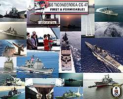 Peter K. Hsu, an artist & naval architect, began painting AEGIS ships for the Naval Sea Systems Command (NAVSEA) in 1987. His drawings have become a prominent feature at the christening and commissioning ceremonies for most AEGIS Cruisers and Destroyers. This drawing includes Fort Ticonderoga and the first 4 ships to bear the name Ticonderoga. It also shows two views of Wayne Meyer, the Father of AEGIS, the USS Norton Sound, AVM-1 which was the test platform for the AEGIS program and buildings at Naval Surface Warfare Center, Port Hueneme, CA. The drawing shows the ship crest, motto and dates of the Christening, Commissioning and Decommissioning. And it shows the ship sponsor, Nancy Reagan breaking the bottle at the Christening ceremony. This drawing is 18 X 24. Cost $10.