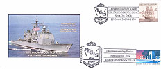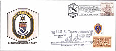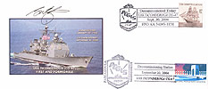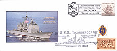 All Cachets were cancelled on the ship on 30 September 2004. The ship cancellation has the AEGIS shield with CG-47 under the ship. In the killer bars to the right it says Decommissioned Today, USS TICONDEROGA CG-47, Sept. 30, 2004, FPO AA 34093-1158. Most of the stamps used for the ship cancellation is the USS CONSTELLATION Sailing ship stamp.