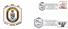 The final Cachet has the 8 sided Radar Shield in Gray with the ship crest in the middle. Above the top three sides it says LAST DAY OF and below the bottom three sides it says U.S. POSTAL SERVICE. In addition to be the ship was commissioned it was also the last day of postal service.