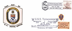 Half of the second cancellations are from the Post Office in Ticonderoga, NY. The cancellation has an outline of the ship and above it it says U.S.S. Ticonderoga, September 30, 2004 and Farewell Station 1983-2004. Below the ship it says Ticonderoga, NY 12883. The Korean War stamp or the Purple Heart stamp are used for this cancellation.