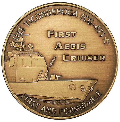 The commemorative antique bronze coins are made by the Northwest Territorial Mint in Auburn, WA. All have the same design which depicts the cruiser on the front along with the ship's motto "First and Formidable" and the words "First AEGIS Cruiser." On the back are the dates of the Christening, Commissioning and Decommissioning. The ship crest is also on the back along with the name of the sponsor, Nancy Reagan. All coins come in a clear acrylic capsule and are two inches in diameter.